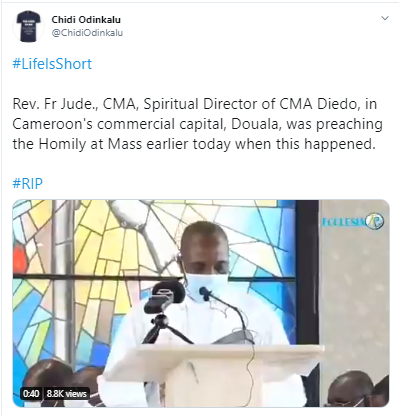Former Chairman of National Human Rights Commission and lawyer, Chidi Odinkalu shared the video on Twitter on Sunday August 30 and wrote, “Rev. Fr Jude., CMA, Spiritual Director of CMA Deido, in Cameroon's commercial capital, Douala, was preaching the Homily at Mass earlier today when this happened #RIP.'